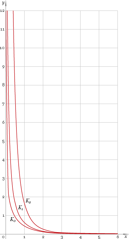 Help 6.33K — modified Bessel function of the second kind1. DefinitionBy definition modified Bessel function is solution of the modified Bessel equation z2 w′′ + z w′ − (z2 + ν2) w = 0As second order equation it has two solutions, second of which has singularity at 0 and is called modified Bessel function of the second kind — Kν. Parameter ν is called order of the function. First solution has no singularity at 0 and is called modified Bessel function of the first kind — Iν. 2. GraphModified Bessel functions of the second kind defined everywhere on the real axis, at 0 functions have singularity, so their domain is (−∞, 0)∪(0, +∞). Graphs of the first three representatives of the second kind modified Bessel function family depicted below — fig. 1.